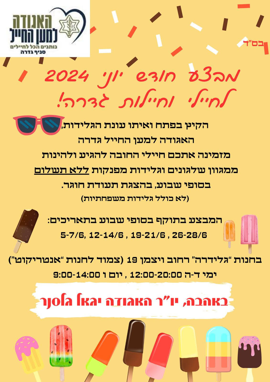תזכורת השבוע (ימים רביעי עד שישי 26-28.6.24) תסתיים הטבת השלגונים ללא עלות לחיילי גדרה שמגיעים לחנות הגלידרה ברחוב ויצמן 19. ההטבה מותנית בהצגת תעודת חוגר .