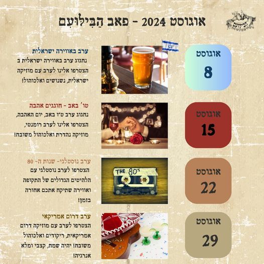 8 באוגוסט: ערב באווירה ישראלית עם מוזיקה ישראלית, נשנושים ואלכוהול משובח!