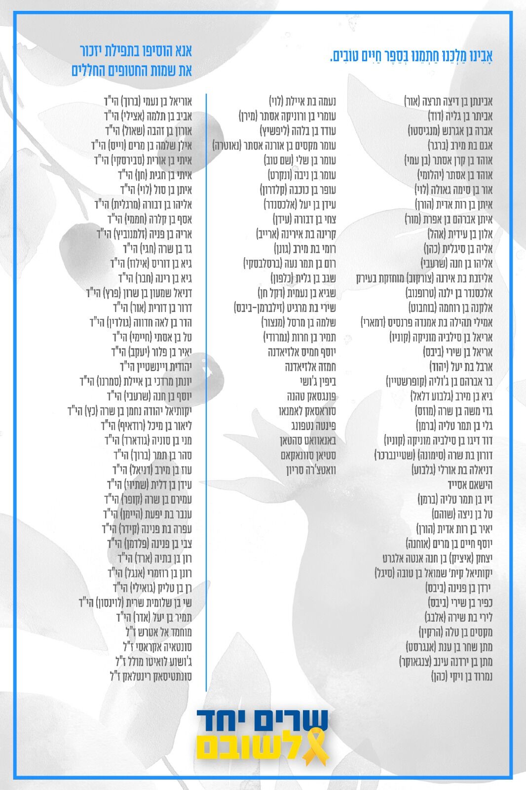 רשימת שמות החטופים לתפילה, שהודפסה וחולקה ברחבי בתי כנסת במדינה, מופיעים 101 שמותיהם של החטופים בתפילה להשבתם.
