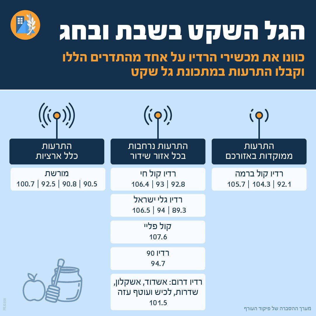שימו לב בתחנות הרדיו הארציות והאזוריות (למעט התחנות בערבית) לא יתקיימו שידורים במהלך יום הכיפורים אך יושמעו בהן התראות פיקוד העורף ועל כן יש להשאיר את הרדיו פועל.