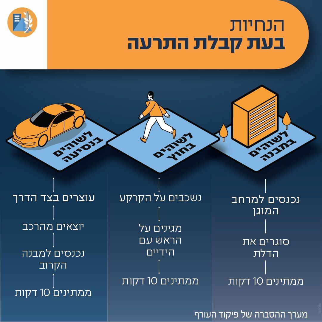 בשבוע שעבר נשלחה הודעת חירום מטעם פיקוד העורף. מטרת ההודעה הינה הנחיית חירום, אשר תשלח במידת הצורך כמה דקות טרם קבלת ההתרעה, על מנת לאפשר לאזרח להגיע למרחב המוגן הטוב ביותר בקרבתו. במקרה שכזה, יובהר כי אין לצאת מהמרחב המוגן עד להודעה חדשה (גם לא בחלוף 10 דקות).