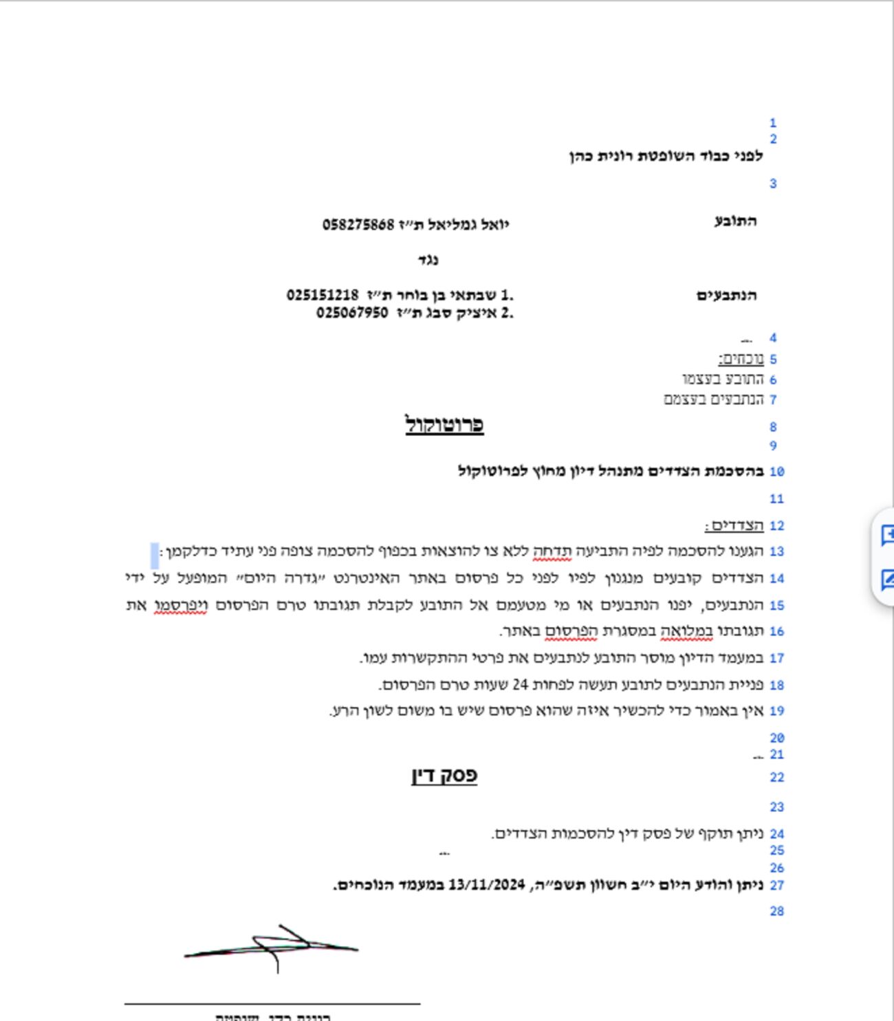 בסוף השבוע פרסם יואל גמליאל פוסט ברשתות החברתיות על החלטת בית המשפט בנוגע לתביעה הגיש כנגד בעלי המקומון בגדרה. מדובר על תביעה שהוגשה לקראת סוף שנת 2023 בסך של 160 אלף ש"ח בגין נזיקין ולשון הרע על פרסומים באתר המקומון. בכתב התביעה נכתב כי על ידי פרסום הדברים באתר הנתבעים נוהגים בחוסר תום לב, בזדון ובכוונה לפגוע בשמו הטוב של התובע (גמליאל) ולהשפילו ולבזותו בעיני הבריות.