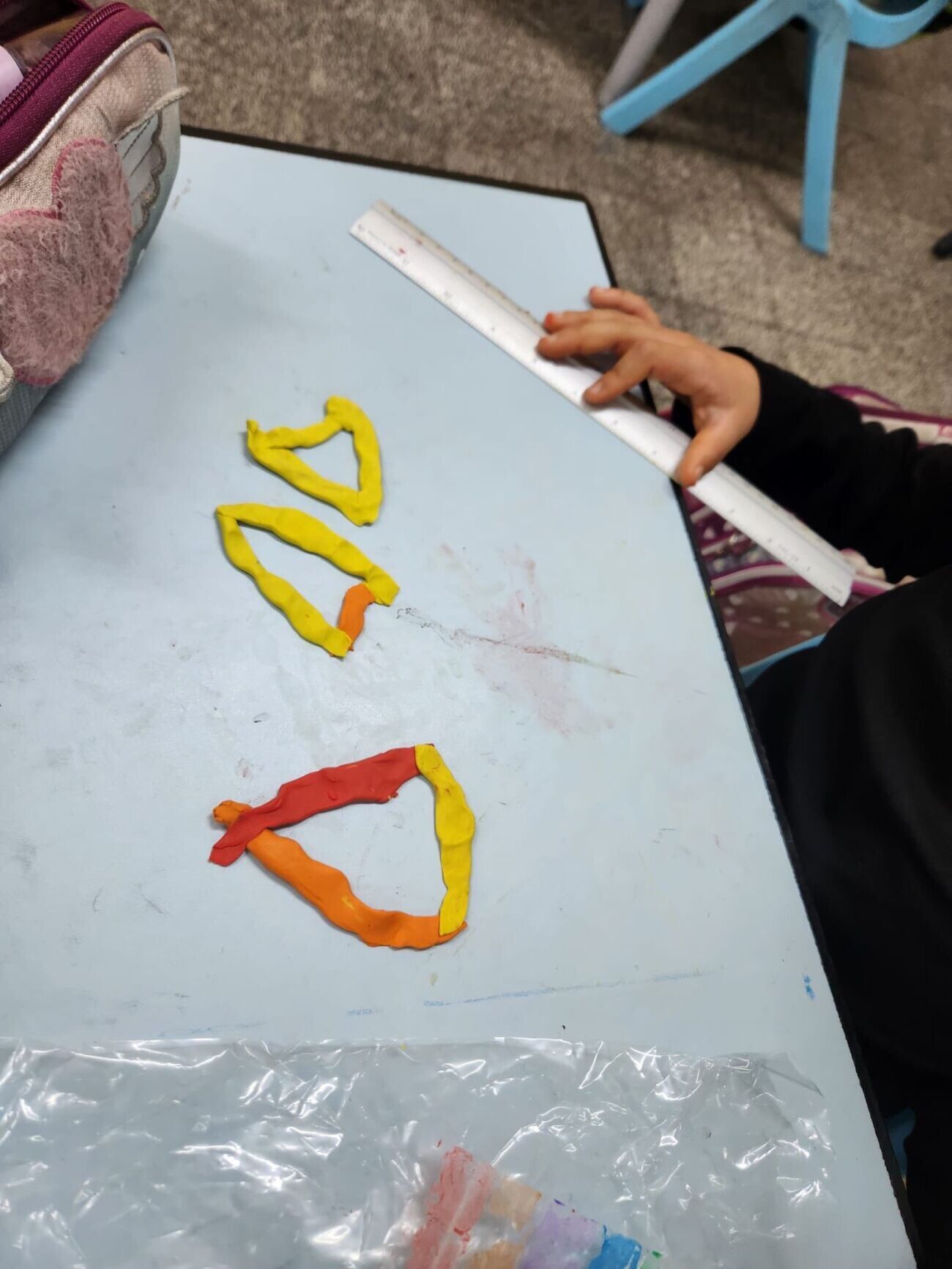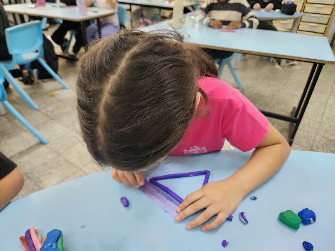 במסגרת המיזם, שזכה לשם "מפעל המשולשים", קיבלו התלמידים משימה לבנות דגמי משולשים מפלסטלינה. הבנייה נעשתה על פי חוק תעשייתי מוגדר: אורך צלע זהה מחייב שימוש בצבע זהה. דרך התנסות זו, הילדים למדו הלכה למעשה למיין משולשים לפי מאפייני הצלעות שלהם: משולש שווה צלעות, שווה שוקיים ושונה צלעות.