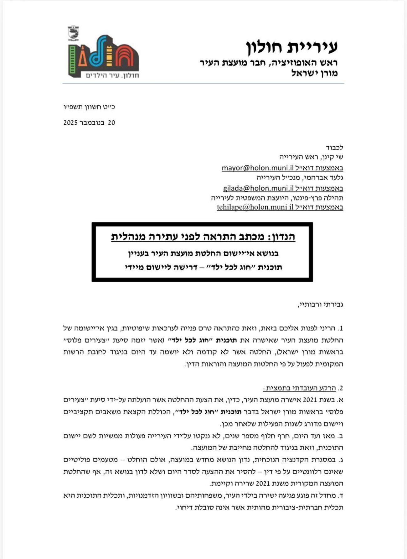 מורן ישראל, ראש האופוזיציה ויו"ר סיעת "צעירים פלוס" בחולון, הודיעה כי היא נוקטת צעדים משפטיים נגד עיריית חולון בגין אי יישום תוכנית "חוג לכל ילד". לדבריה, שלחה מכתב התראה לראש העירייה שי קינן ולמנכ"ל העירייה לפני הגשת עתירה בנושא.
