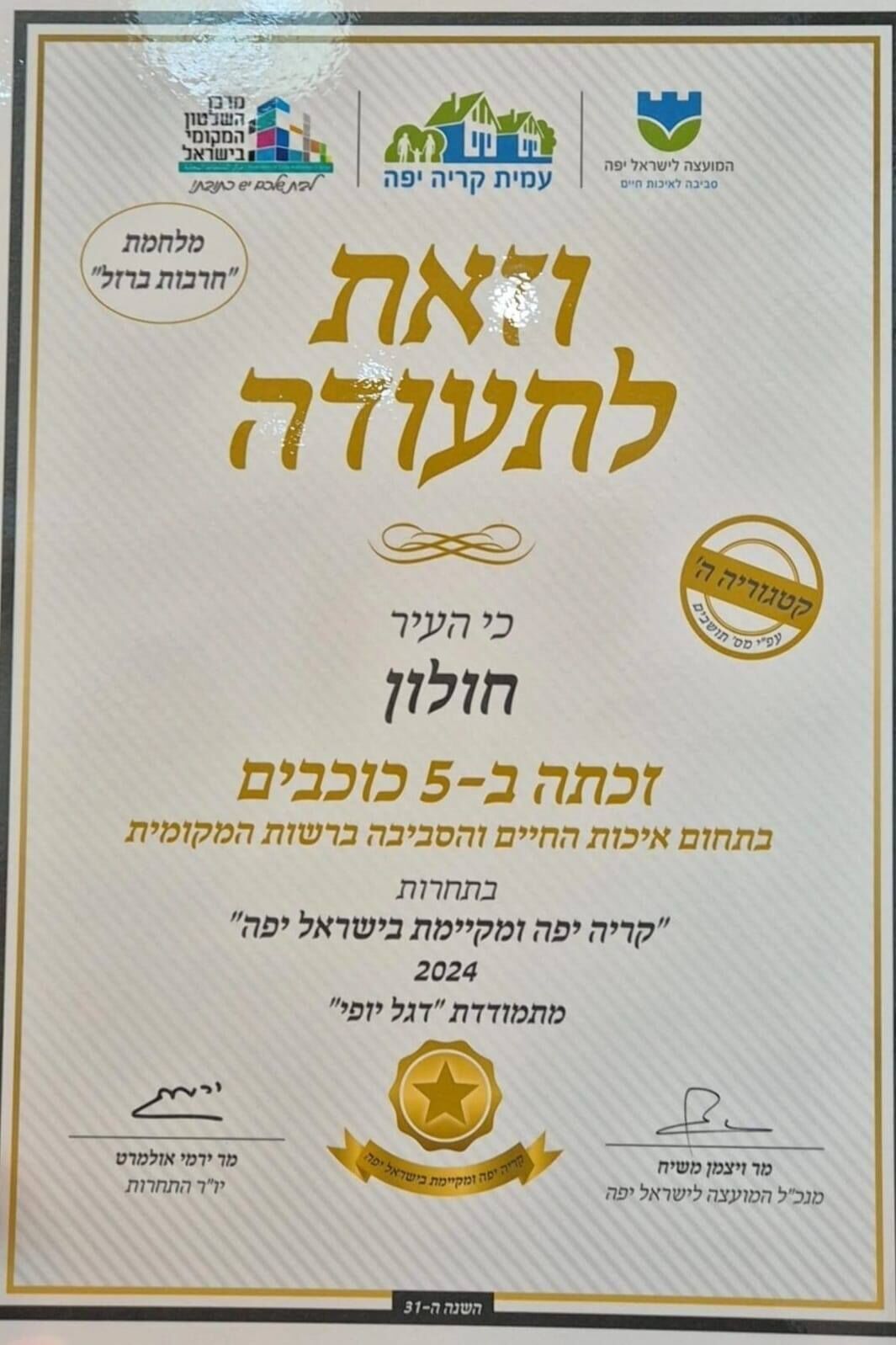 הישג זה הוא תוצאה של עבודה מסורה של עובדות ועובדי העירייה, תושבי חולון וכל השותפים לעשייה.