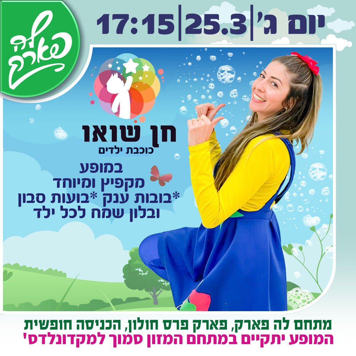 ביום שלישי, ה-25 במרץ, בשעה 17:15, יתקיים מופע מיוחד במתחם לה פארק שבפארק פרס חולון. המופע יכלול את חן שואו, מלכת הילדים, בהופעה מקפיצה ומשמחת המשלבת בובות ענק, בועות סבון, ומסיבה לכל המשפחה. כל ילד יקבל בלון שמח במתנה.