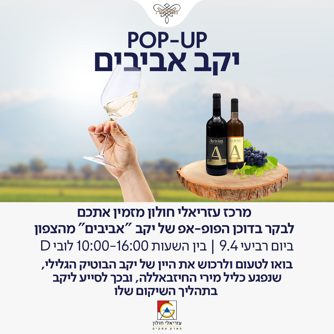 דוכן הפופ-אפ של יקב "אביבים" מהצפון יגיע שוב למתחם עזריאלי חולון ביום רביעי הקרוב, לקראת חג הפסח. הדוכן יפעל בלובי D, ומטרתו לסייע לשיקום היקב שנפגע במהלך המלחמה. הציבור מוזמן להגיע ולתמוך ביוזמה זו.