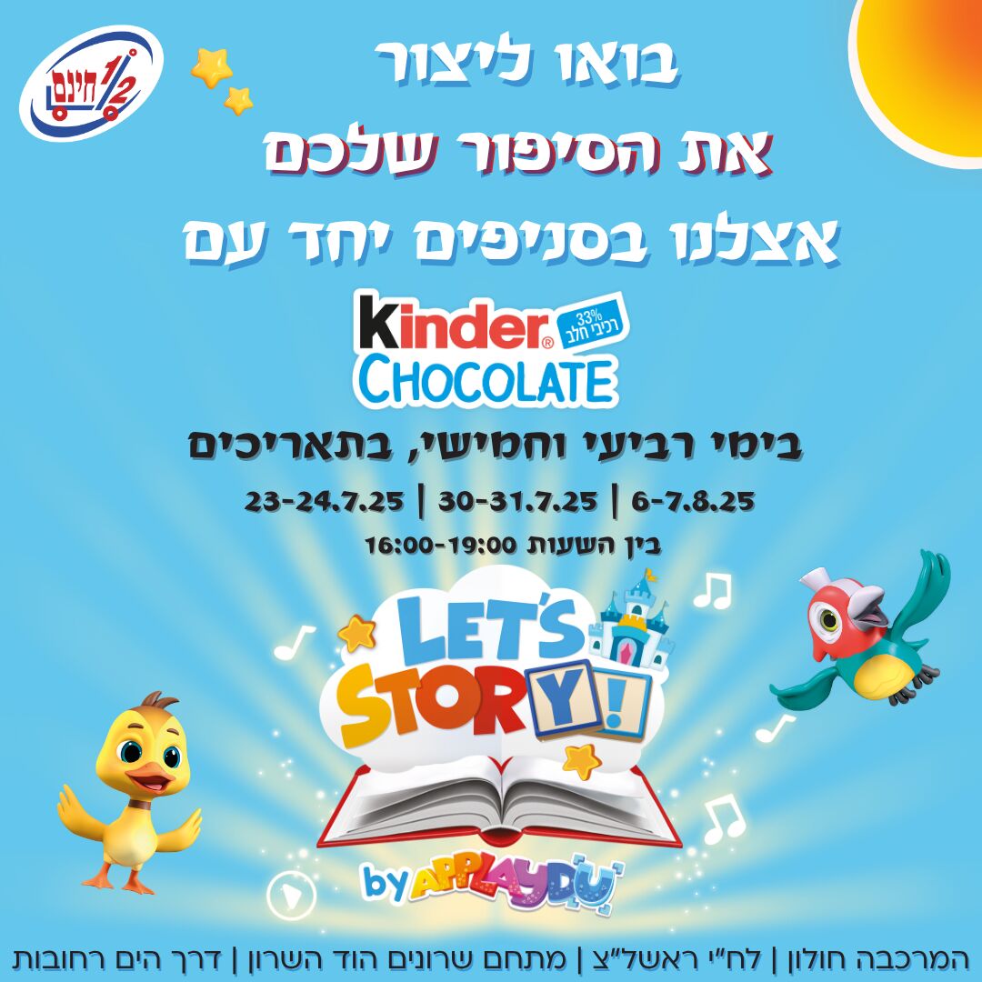 קינדר Let’s Story! מגיע לסניפי "חצי חינם" עם מתחמים חווייתיים לכל המשפחה בימי רביעי וחמישי בתאריכים 23-24 ביולי וגם במהלך חודש אוגוסט