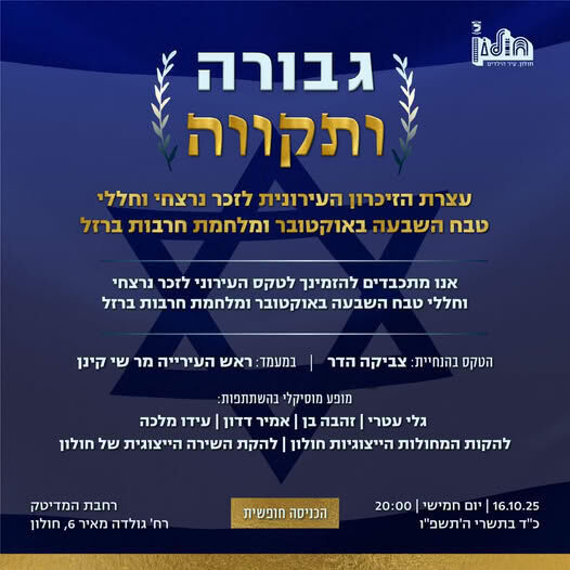 עיריית חולון תקיים עצרת זיכרון עירונית תחת הכותרת "גבורה ותקווה", לזכר נרצחי וחללי טבח השבעה באוקטובר ומלחמת 'חרבות ברזל'.
