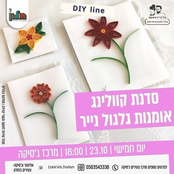 החודש בDIY LINE סדנת אומנות גלגול נייר. בסדנה ניצור כרטיס ברכה או תמונה מקורית ונלמד טכניקה מיוחדת. יצירה בגלגולי נייר (קווילינג בלועזית) היא טכניקת יצירה מיוחדת השייכת לתחום ריפוי בעיסוק, מפתחת מוטוריקה עדינה, יצירתיות וביטוי עצמי, כך שתוכלו ליהנות לא רק מתוצאה אלא גם מתהליך.