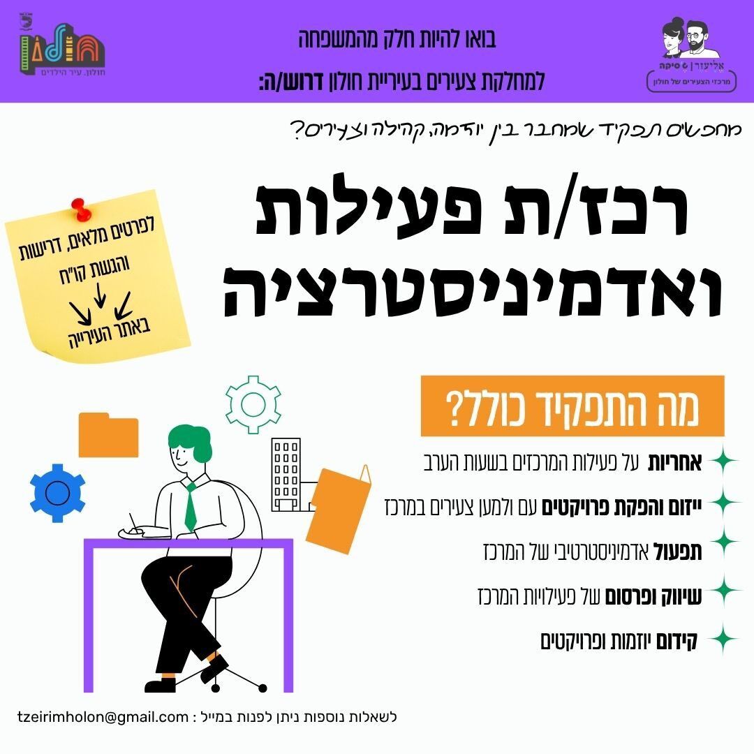 - רכז/ת פעילות ואדמיניסטרציה - לפרטים והגשת מועמדות ניתן להיכנס לקישור: https://did.li/4B1rl