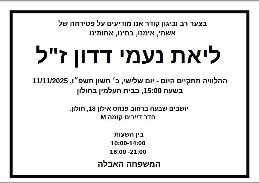 הלווייתה של ליאת נעמי דדון תתקיים היום בשעה 15:00 בבית העלמין בחולון.