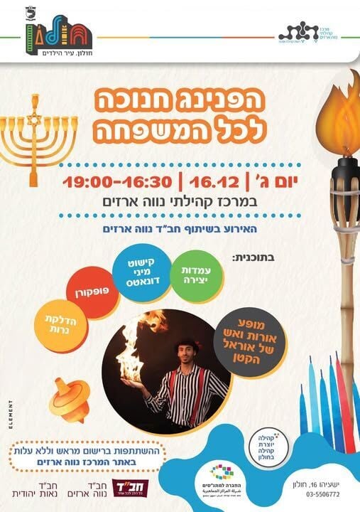 הפנינג חנוכה חגיגי לכל המשפחה יתקיים במרכז הקהילתי נווה ארזים בחולון ביום שלישי ה-16.12 עם מופע אורות ואש, פופקורן, הדלקת נרות, עמדות יצירה ועוד