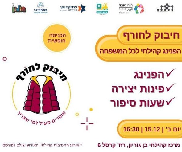 הפנינג מיוחד לכל המשפחה יתקיים במרכז קהילתי בן גוריון בחולון היום (שני 15.12) במסגרת מיזם ההתנדבות "חיבוק לחורף"
