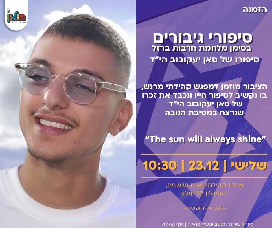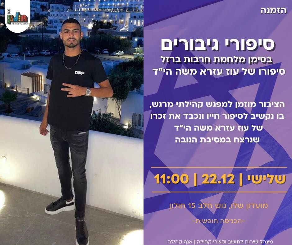 "סיפורי גיבורים" בחולון: מפגשי זיכרון עם משפחות הנופלים עוז עזרא משה, סאן יעקובוב ורס"ן בן ברונשטיין ז"ל ב-22 וב-23 בדצמבר