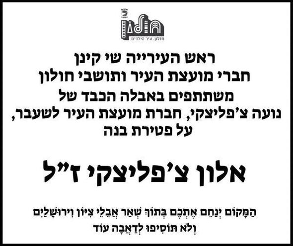 עיריית חולון פרסמה הודעת תנחומים בה היא משתתפת בצערה של נועה צ׳פליצקי, חברת מועצת העיר לשעבר, על מות בנה אלון.