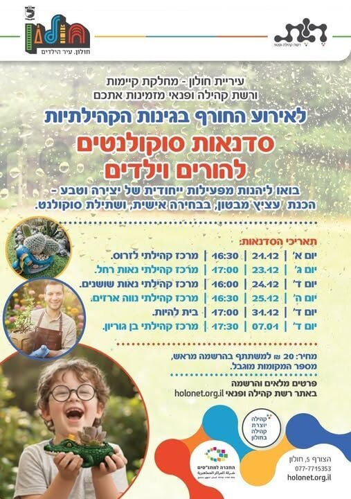 עיריית חולון, באמצעות מחלקת הקיימות ורשת קהילה ופנאי, מזמינה את התושבים לאירוע חורף שיתקיים בגינות הקהילתיות. האירוע יכלול סדנאות סוקולנטים המיועדות להורים ולילדים.