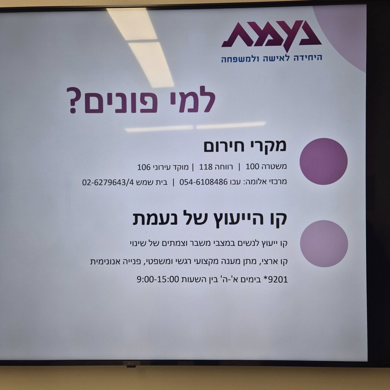 מרחבי הטיפול מהווים לעיתים קרובות את המקום הראשון בו אישה מרשה לעצמה להיחשף, לספר, לרמוז או לשתוק. במסגרת ההכשרה, המשתתפות למדו כיצד להיות שם עבור הלקוחות, לזהות סימנים גלויים וסמויים, להקשיב באמת, לשאול את השאלות הנכונות ולפתוח דלת לעזרה ברגישות ובאחריות.
