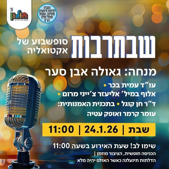 שבת תרבות בתיאטרון חולון בהנחיית גאולה אבן סער: עו״ד עמית בכר, אלוף במיל׳ אליעזר צ׳ייני מרום וד"ר חן קוגל יתארחו באירוע שיתקיים בשבת ה-24.1