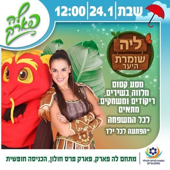 ביום שבת, ה-24 בינואר 2026, בשעה 12:00, תתקיים במתחם לה פארק בפארק פרס בחולון הפעילות "ליה, שומרת היער". מדובר בפעילות חווייתית המיועדת לכל המשפחה.