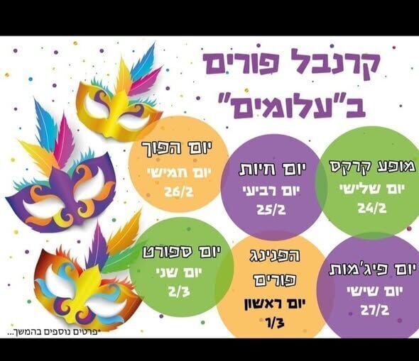 בית ספר עלומים בחולון מציין את חג הפורים עם "קרנבל פורים" מיוחד שצפוי להתפרס על פני מספר ימים, החל מה-24 בפברואר ועד ה-2 במרץ.
