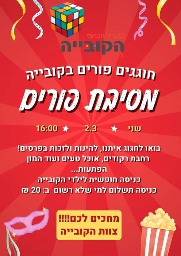 מרכז קהילתי לזרוס וקנטור בחולון מזמין את ילדי העיר בגילי 9 עד 12 לחגיגת פורים מיוחדת במועדון "הקובייה".