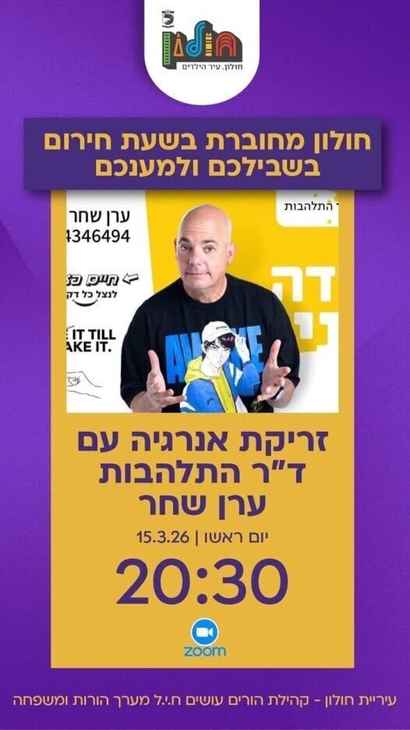 עיריית חולון וקהילת "הורים עושים ח.י.ל" (חושבים, יוזמים, לומדים) יקיימו הערב (ראשון, 15.3.26) בשעה 20:30 מפגש הדרכה והשראה מקוון בזום. המפגש, המתקיים במסגרת המיזם "חולון מחוברת בשעת חירום", נועד לספק חיזוק והעצמה לתושבים בצל אתגרי התקופה.