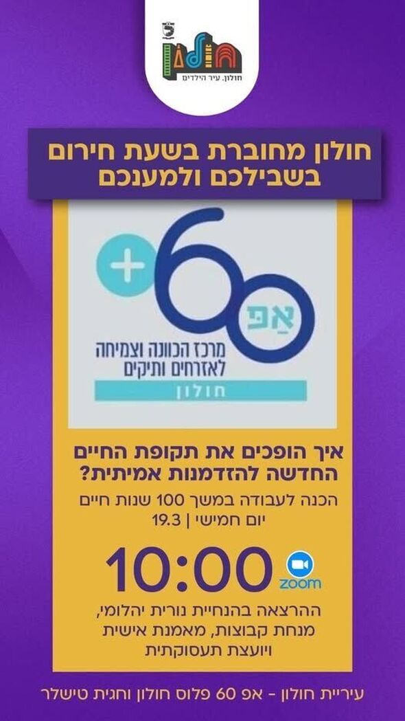 הרצאה מקוונת לאזרחים ותיקים בחולון: עבודה ומשמעות בעידן של 100 שנות חיים תתקיים ב-19.3