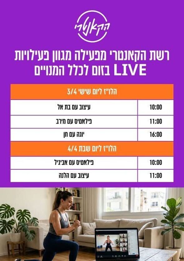 רשת הקאנטרי בחולון מציגה: לו"ז אימוני כושר מקוונים למנויים לסוף השבוע הקרוב, 3-4 באפריל