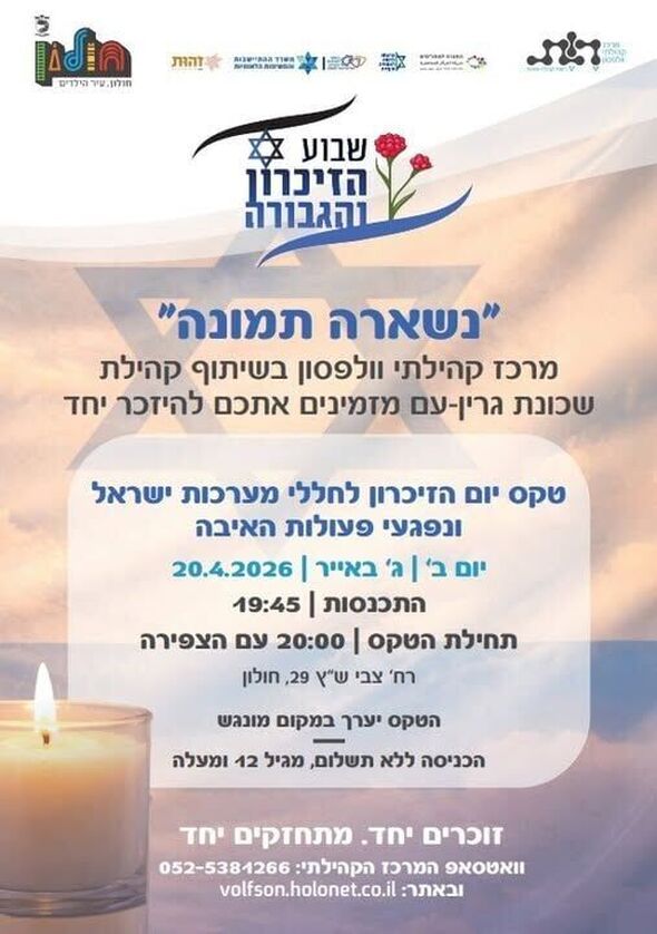 טקס יום הזיכרון במרכז קהילתי וולפסון בחולון: הציבור מוזמן להתייחד עם זכר הנופלים ב-20 באפריל 2026