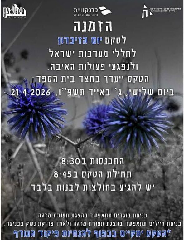 הטקס ייערך מחר, יום שלישי, ג' באייר תשפ"ו (21.4.2026), בחצר בית הספר. שלב ההתכנסות יחל בשעה 08:30, והטקס עצמו יתחיל בשעה 08:45. באי האירוע מתבקשים להגיע בחולצות לבנות בלבד.