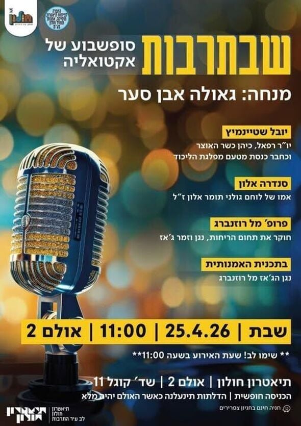 תיאטרון חולון יקיים אירוע "שבתרבות" – בוקר העוסק בענייני אקטואליה ותרבות, ביום שבת הקרוב, ה-25 באפריל 2026. את המפגש תנחה אשת התקשורת גאולה אבן סער.