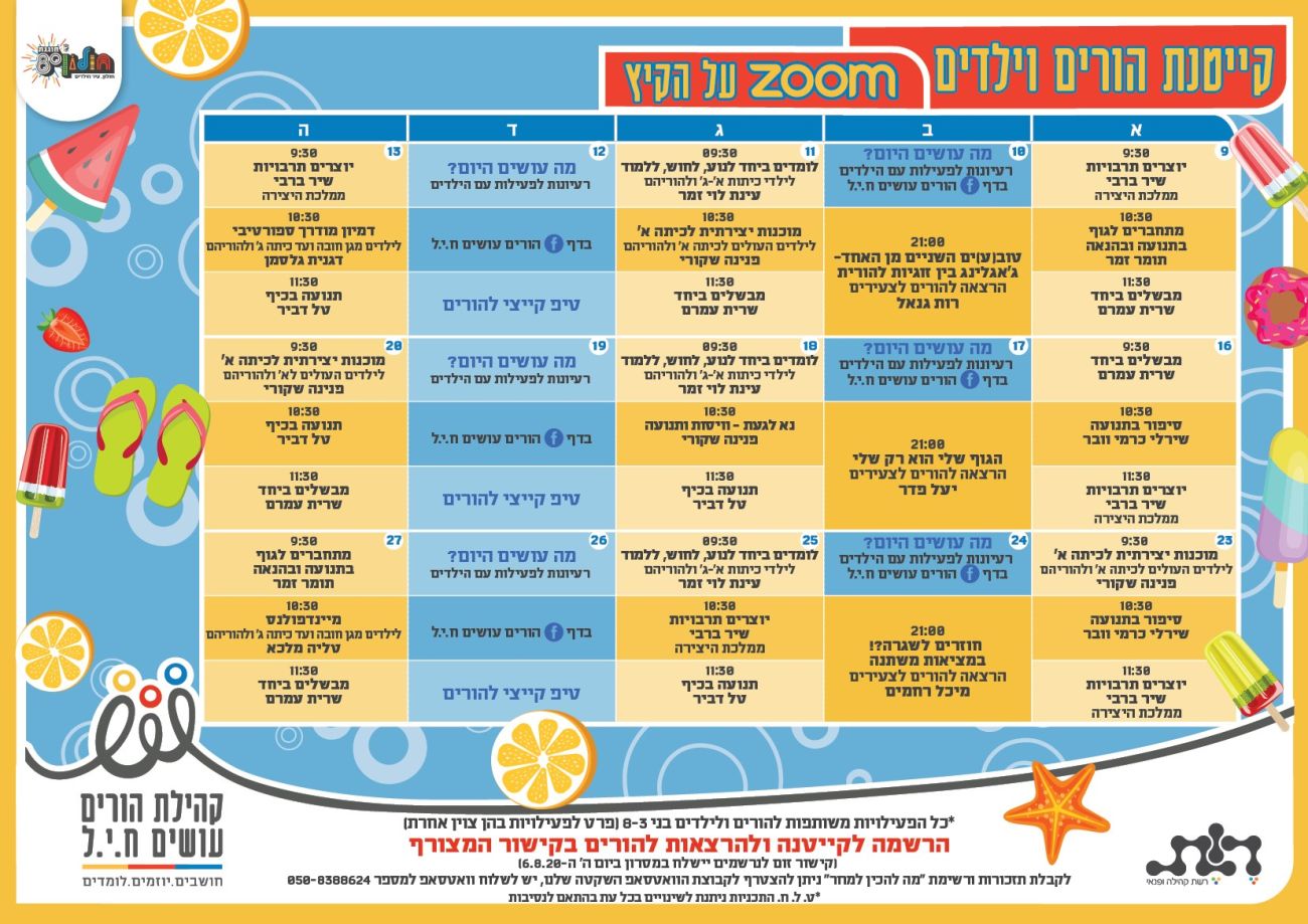 בימים שני ורביעי, שבהם לא מתקיימות פעילויות בזום, יועלו בעמוד הפייסבוק של קהילת הורים עושים ח.י.ל תוכניות מגוונות ורעיונות לפעילויות משותפות של הורים וילדים.