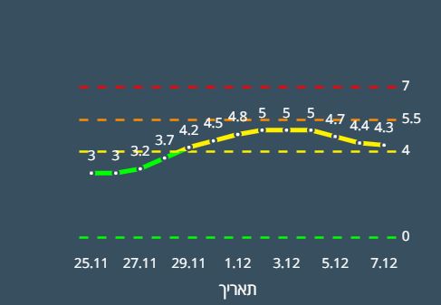 | תאריך | ציון יומי על פי תוכנית הרמזור | חולים חדשים לכל 10,000 איש | אחוז הבדיקות החיוביות | מספר החולים הפעילים |