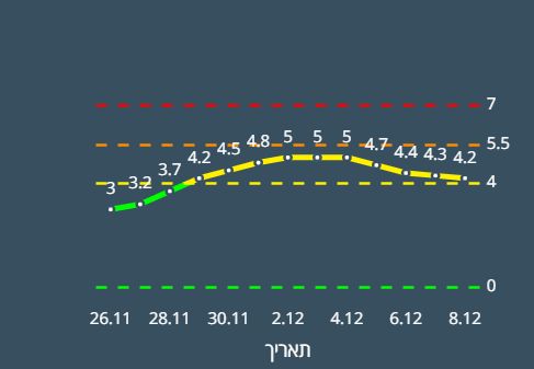 | תאריך | ציון יומי על פי תוכנית הרמזור | חולים חדשים לכל 10,000 איש | אחוז הבדיקות החיוביות | מספר החולים הפעילים |