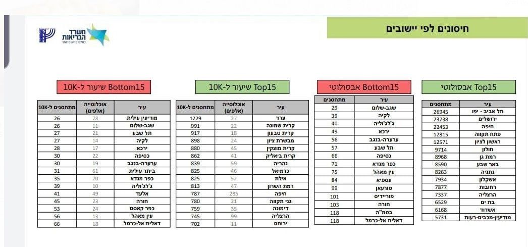 משרד הבריאות מפרסם הבוקר שלישי את נתוני החיסונים בערים בישראל.