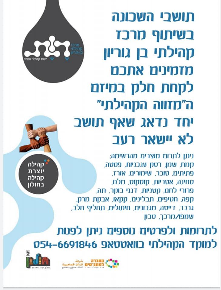 אם אתם מעוניינים לסייע ולתרום ניתן לתרום מוצרי מזון יבשים כגון: קמח, פסטה, אורז, פתיתים, קופסאות שימורים, שמן, מלח, קורנפלקס, וכד'את המוצרים ניתן להניח בארגז המוצב בכניסה למרכז הקהילתי ברחוב קרסל 6, חולון.