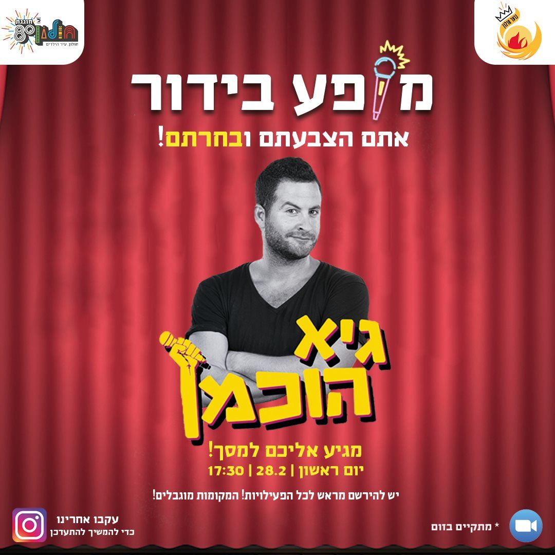 בראשון, 28.2.21, בשעה 17:30, בזום יעלה מופע בידור משעשע עם גיא הוכמן, שיתקיים על פי בחירת בני הנוער (ההרשמה מראש. מספר המקומות מוגבל).