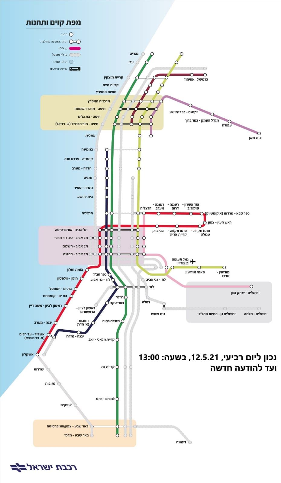 החל מהשעה 13:00 (בקירוב) תחודש תנועת רכבות הנוסעים בקטע המסילה שבין תחנות ת"א ההגנה ולוד, שנסגר אמש, ותחודש תנועת הרכבות לבאר שבע (דרך הקו העובר בלוד, מזכרת בתיה, להבים רהט, קריית גת וכ').