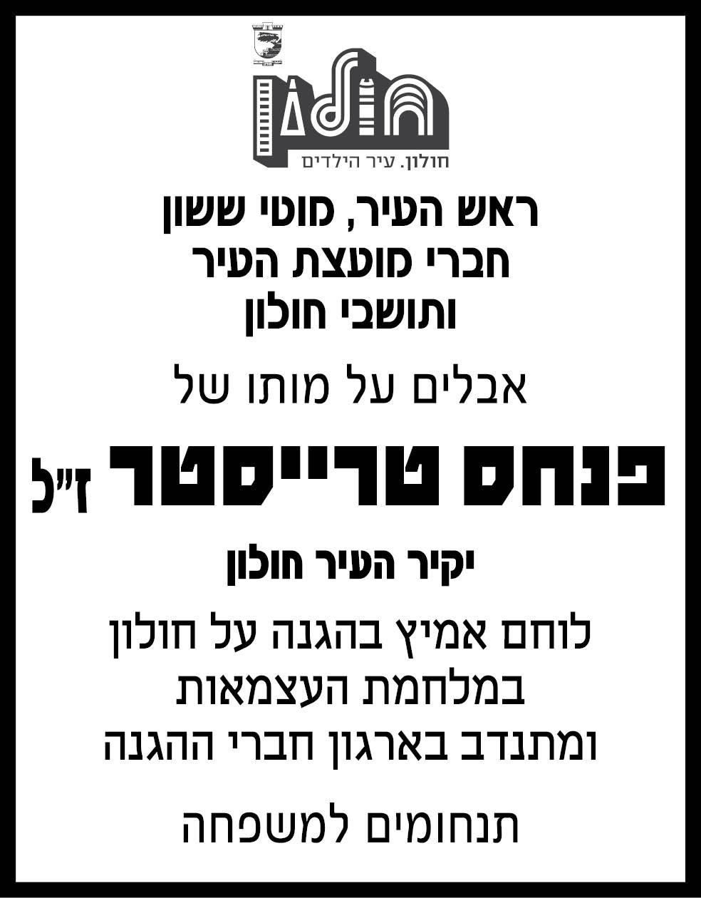 יקיר העיר חולון, פנחס טרייסטר נפטר אמש.