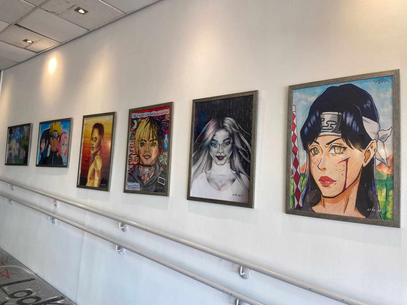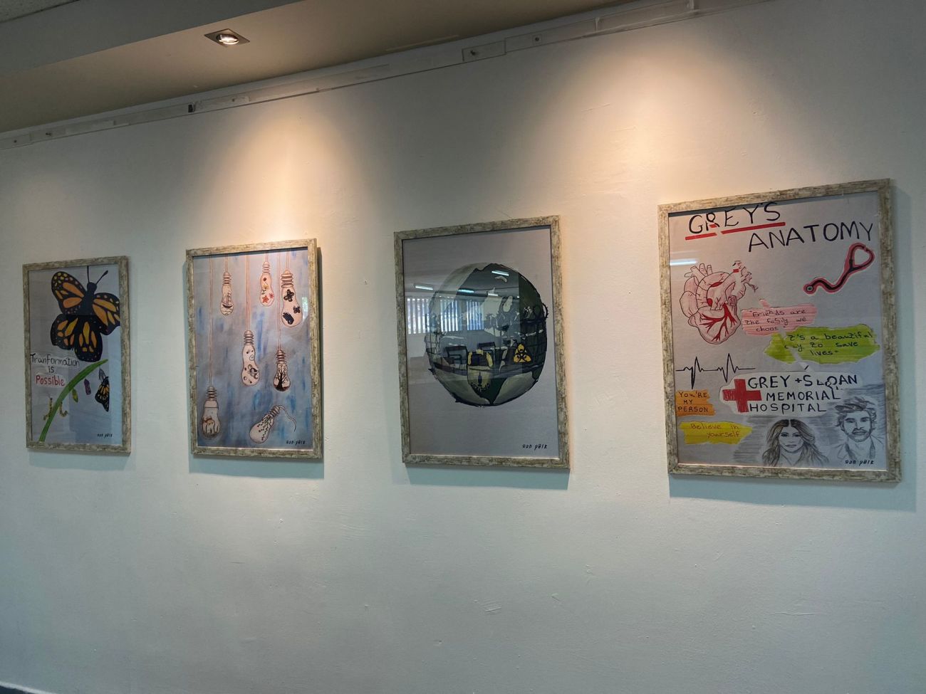 נועם שלום, אופק חבה, ניקול ספיבקוב, רוני ימין ויאנה קופין תלמידות הגימנסיה הרצוג למדעים ואומנות בחולון, שיתפו את יצירותיהן בתערוכה לכבוד תחילת השנה בחלל בית הספר