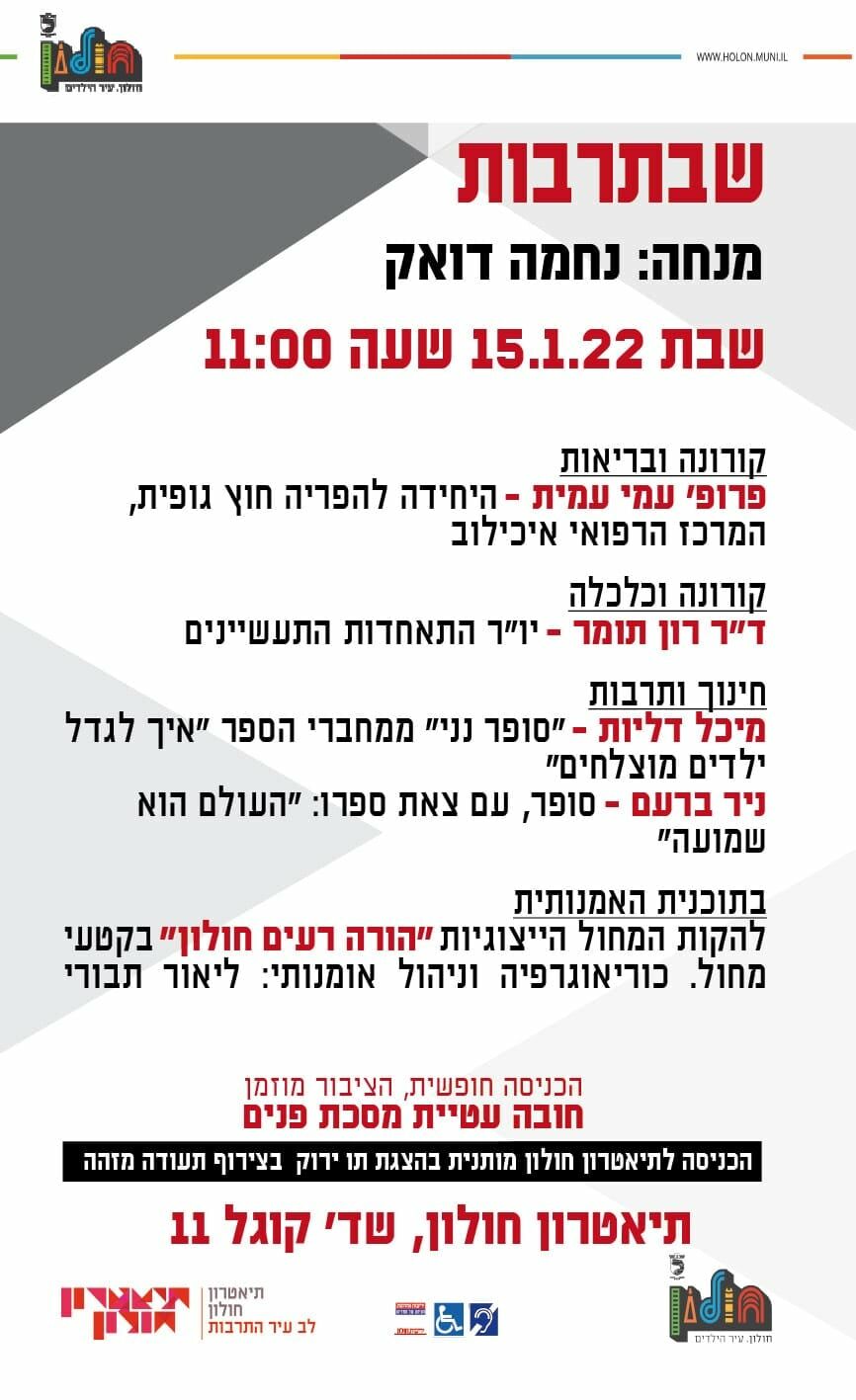 שבת תרבות תתקיים בתיאטרון חולון ביום שבת (15.1) בהנחיית נחמה דואק ובהשתתפות מיכל דליות, יו"ר התאחדות התעשיינים רון תומר ואורחים נוספים.