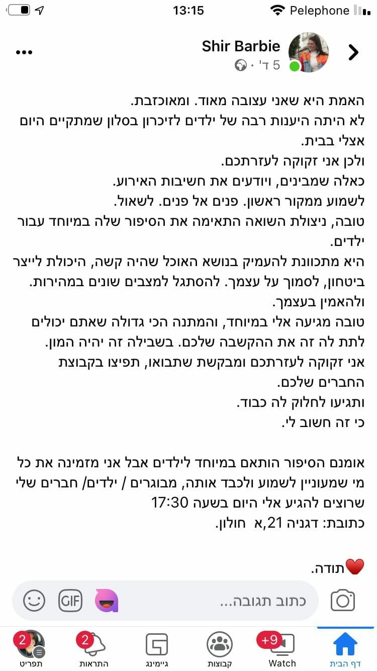 מצורף הפוסט אותו פירסמה שיר בבקשה שיגיעו כמה שיותר משתתפים.