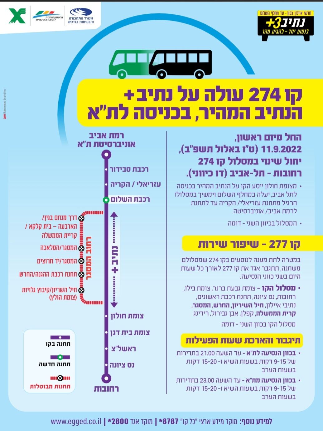 החל מיום ראשון 11.9 יחולו שינויים במסלולי קווי 274 ו277 הנוסעים בין רחובות- ראשון לציון- חולון- תל אביב