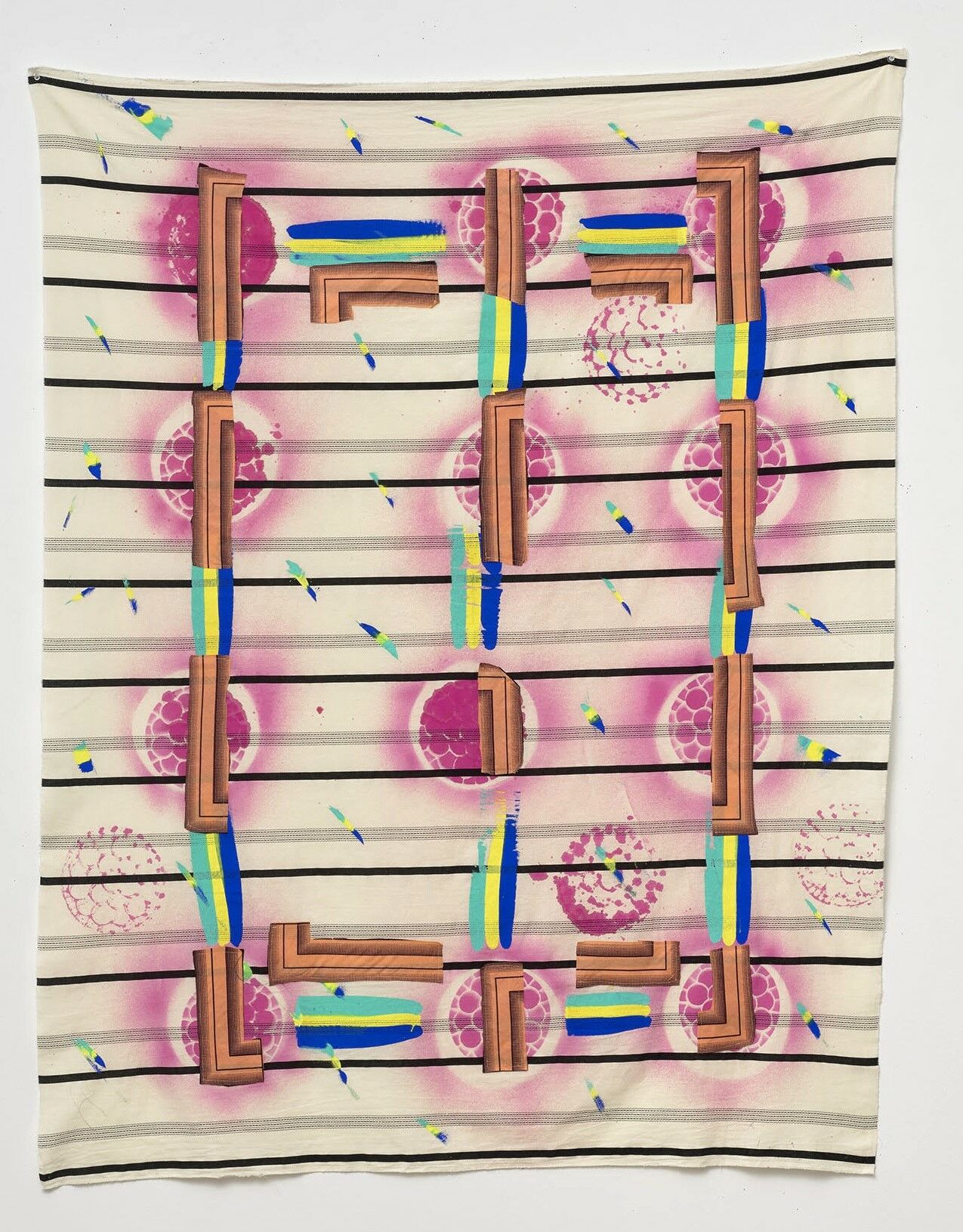 אדלר, ילידת קנדה, מחלקת את זמנה בין תל אביב לטורונטו ובשנים האחרונות שוהה מספר חודשים בשנה בהוואי. בכל ארץ היא יוצרת מתוך מבחר הבדים המקומיים שהיא מוצאת כשהיא מתחקה אחר האסתטיקה האופיינית ורוח המקום והזמן. הבדים מהם עשויות העבודות מישראל שהן עיקר התערוכה, אמנם אינם מיוצרים בארץ אלא מיובאים בהתאם לטעם המקומי, מאופיינים בגוונים בהירים של ארץ שטופת שמש. בעבודה מקנדה הבדים אטומים והצבעים רוויים. הטריפטיכון הססגוני מהוואי מבדים פרחוניים משקף את עושר הטבע והשפע של הצמחייה באסתטיקה המקומית.
