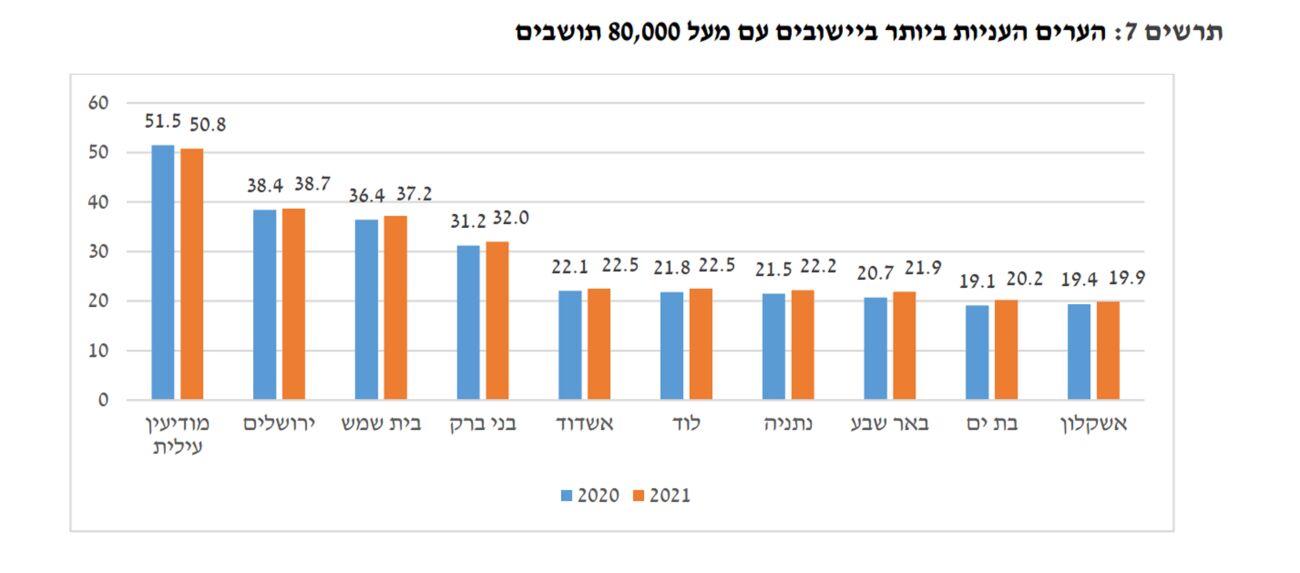 בשנת 2021 עמד מספר העניים בישראל על יותר מ 1.95 מיליון תושבים אשר מהווים 21% מהאוכלוסייה. 853,823 מהם הם ילדים ו212,324 הם אזרחים ותיקים. כאשר משווים זאת לשנת 2020 הנתונים מראים על עלייה בעוני של אזרחי ישראל.