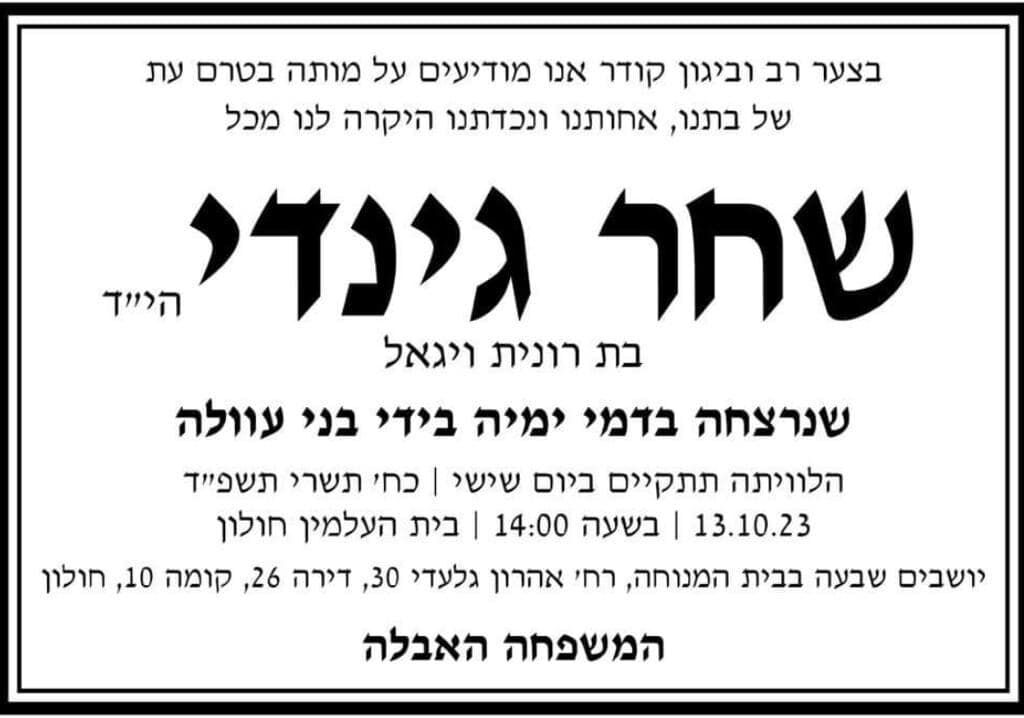 שחר גינדי, תושבת חולון נרצחה במסיבה ביום שבת הארור בקיבוץ רעים. הלווייתה תתקיים היום, יום שישי בשעה 14:00 בבית העלמין חולון.