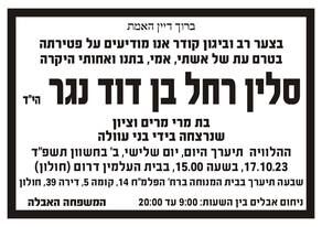 הלווייתה של סלין תתקיים היום 17.10 בשעה 15:00 בבית העלמין בחולון.