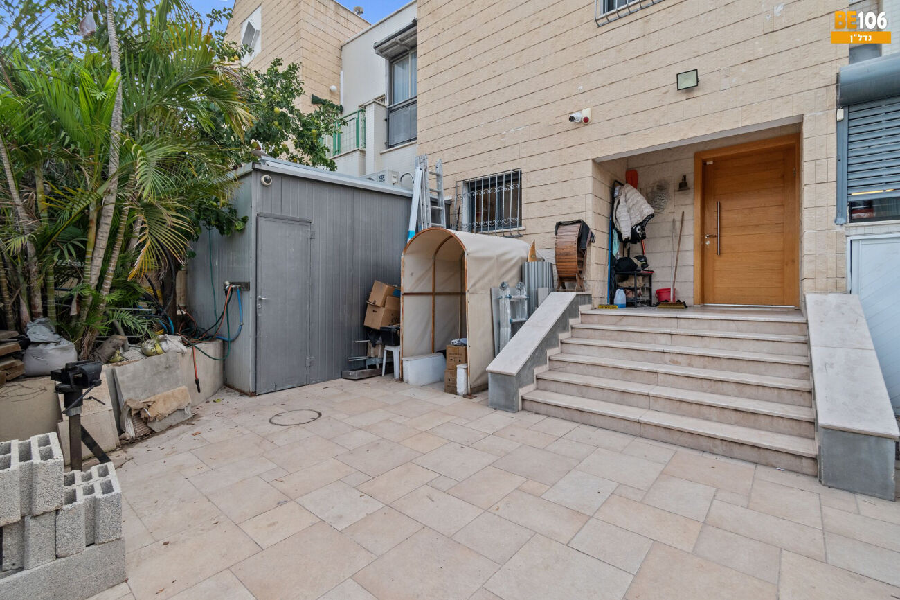 חצר קדמית עם חניה פרטית ומבואת כניסה + מחסן. גודל החתר הקדמית: 50 מטר.