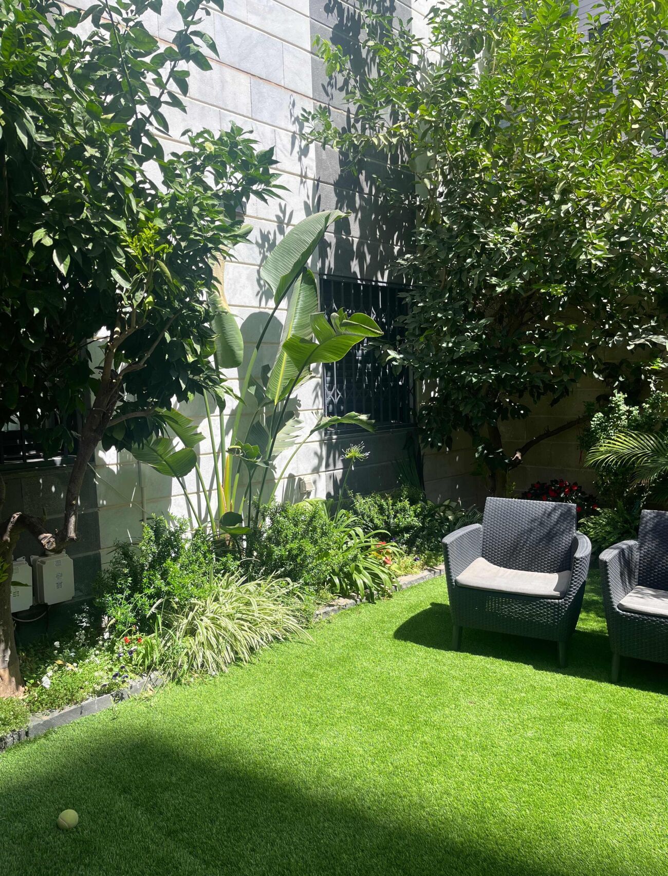 גינה גדולה ומרווחת עם עצי פרי בוגרים .כ100 מטר חתיכה אחת.2 חניות נפרדות לגמרי ואחת מהם נגישה. מחסן גדול.בנין בוטיק.